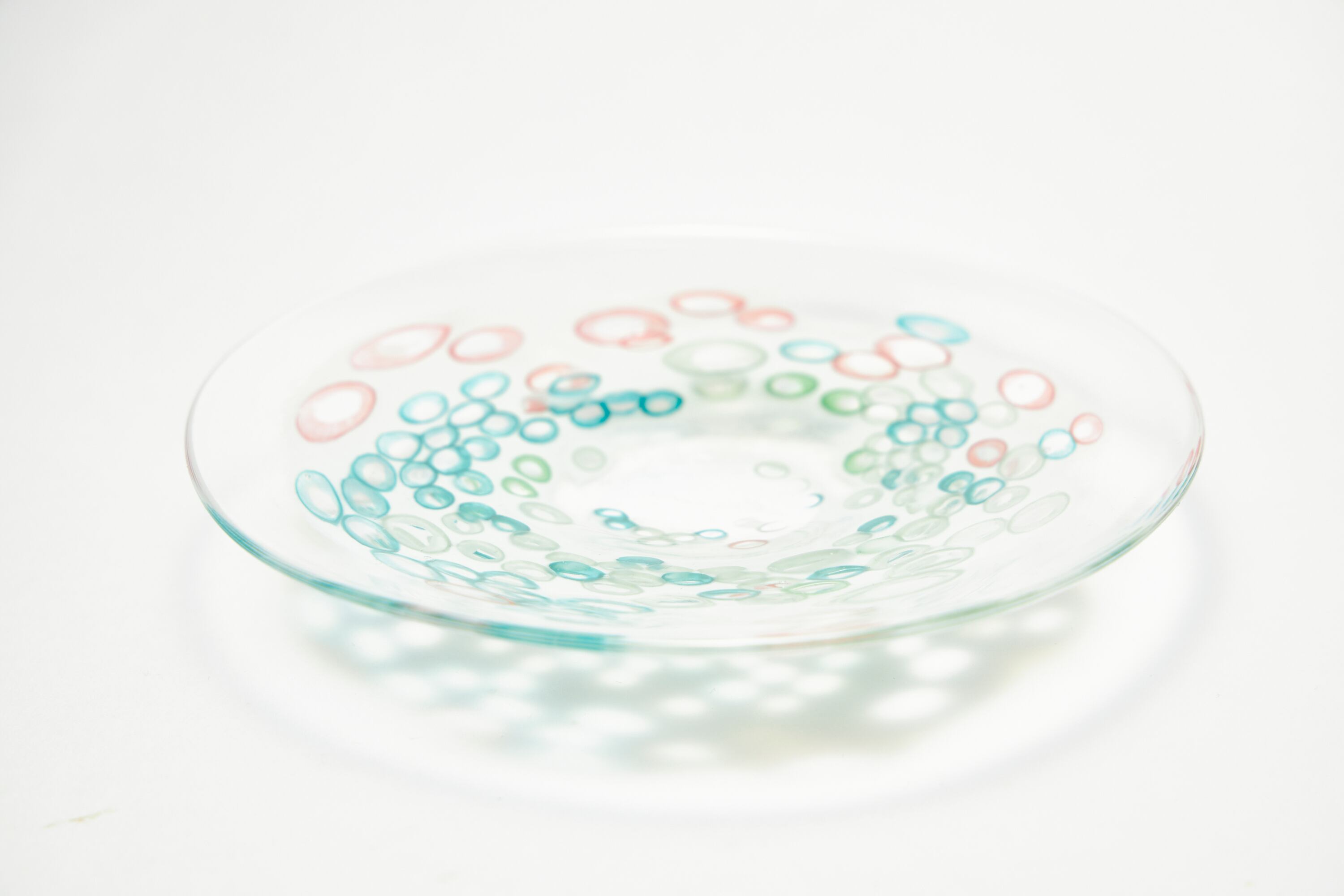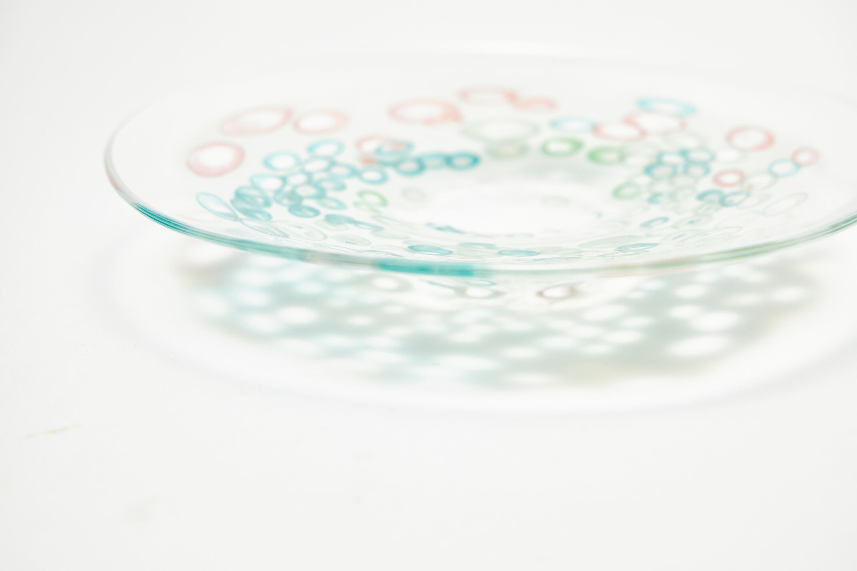 丸いパーツをたくさんつけて、細胞のような、泡のような不思議なお皿ができました。