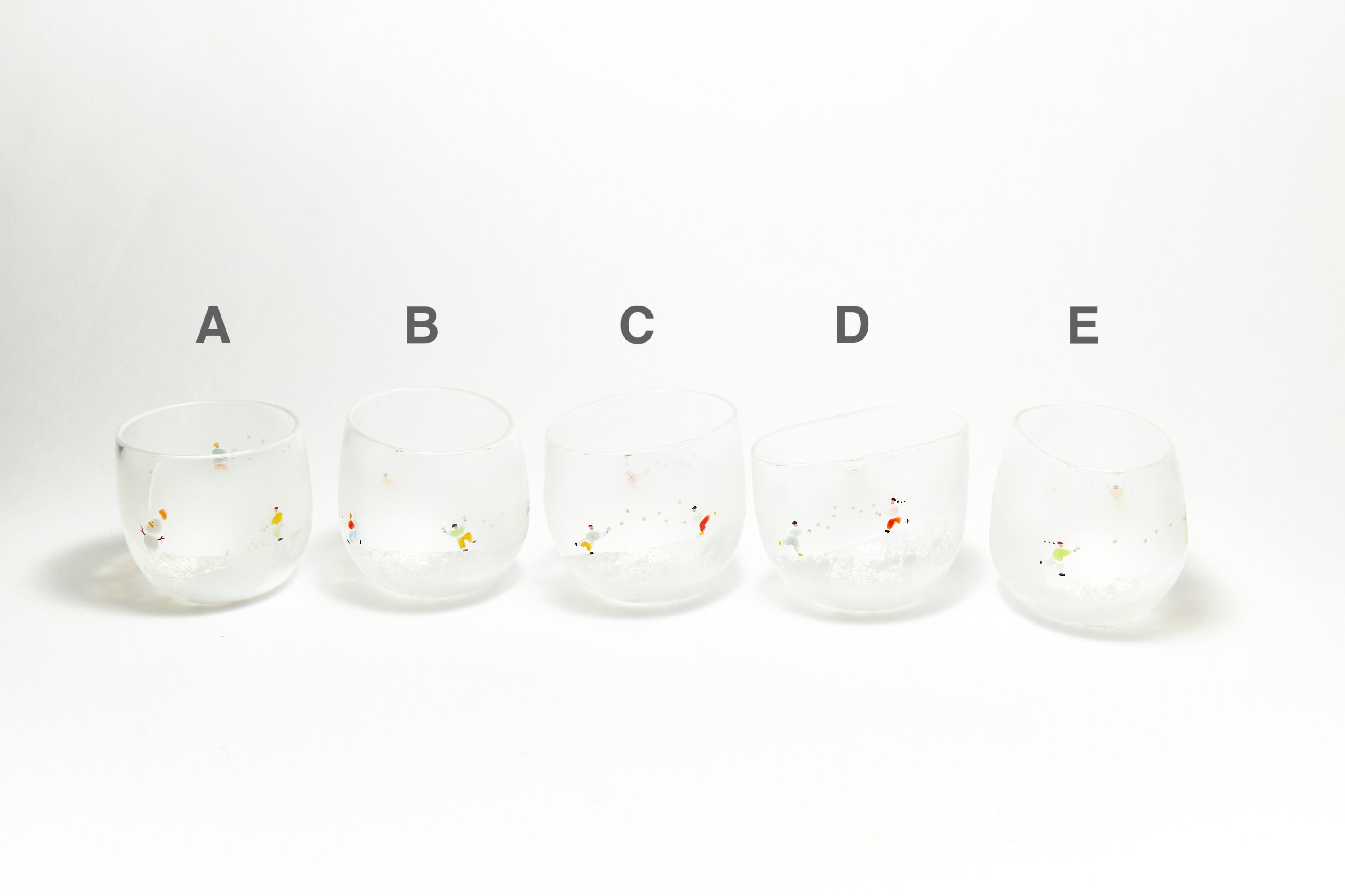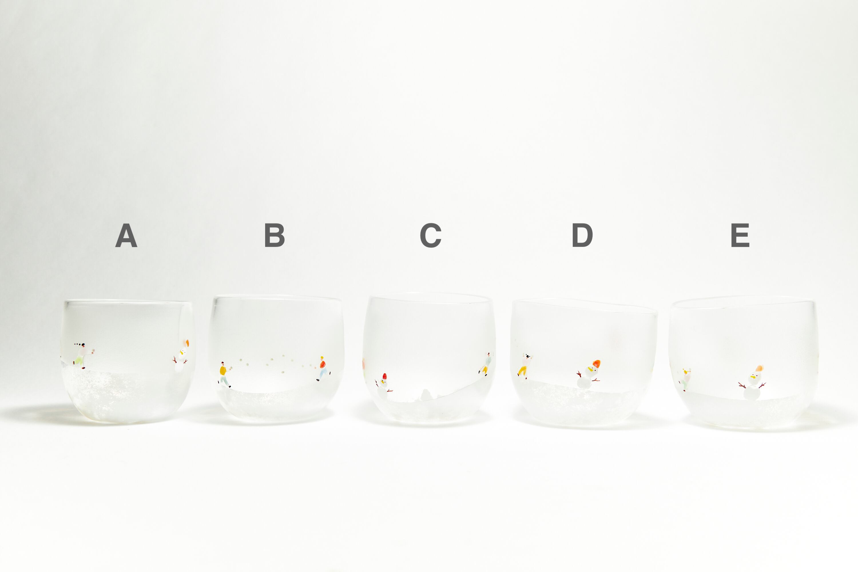 Aのグラスは、上から見ると真円に近い形ですが、雪だるまの部分の内側に縦に凹凸のあるスジが1本確認できます。B〜Eのグラスは、制作工程上、歪みが強く出たものです。歪み具合は個体差がございますので、お写真をご確認いただき、気になるようでしたらお問い合わせください。