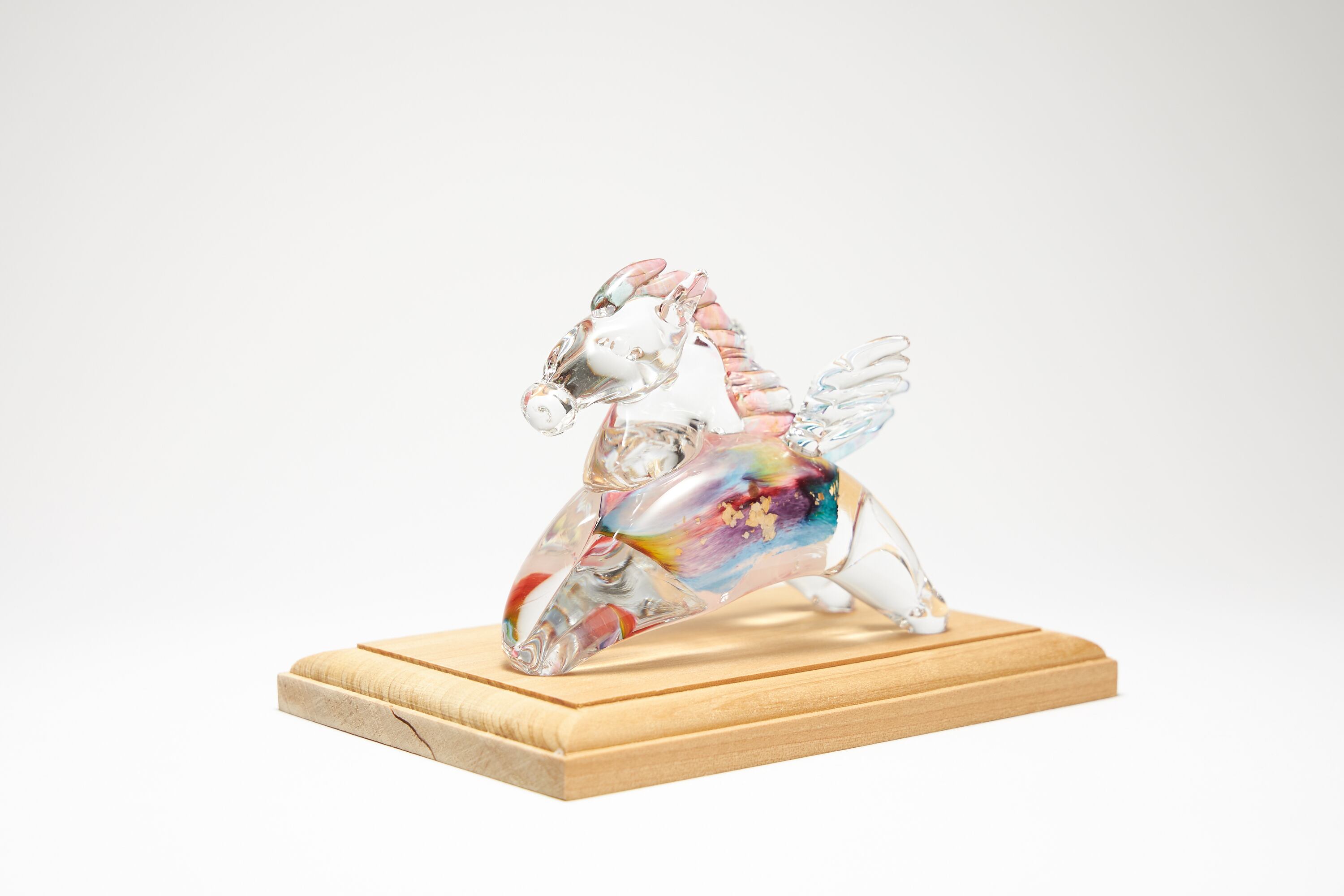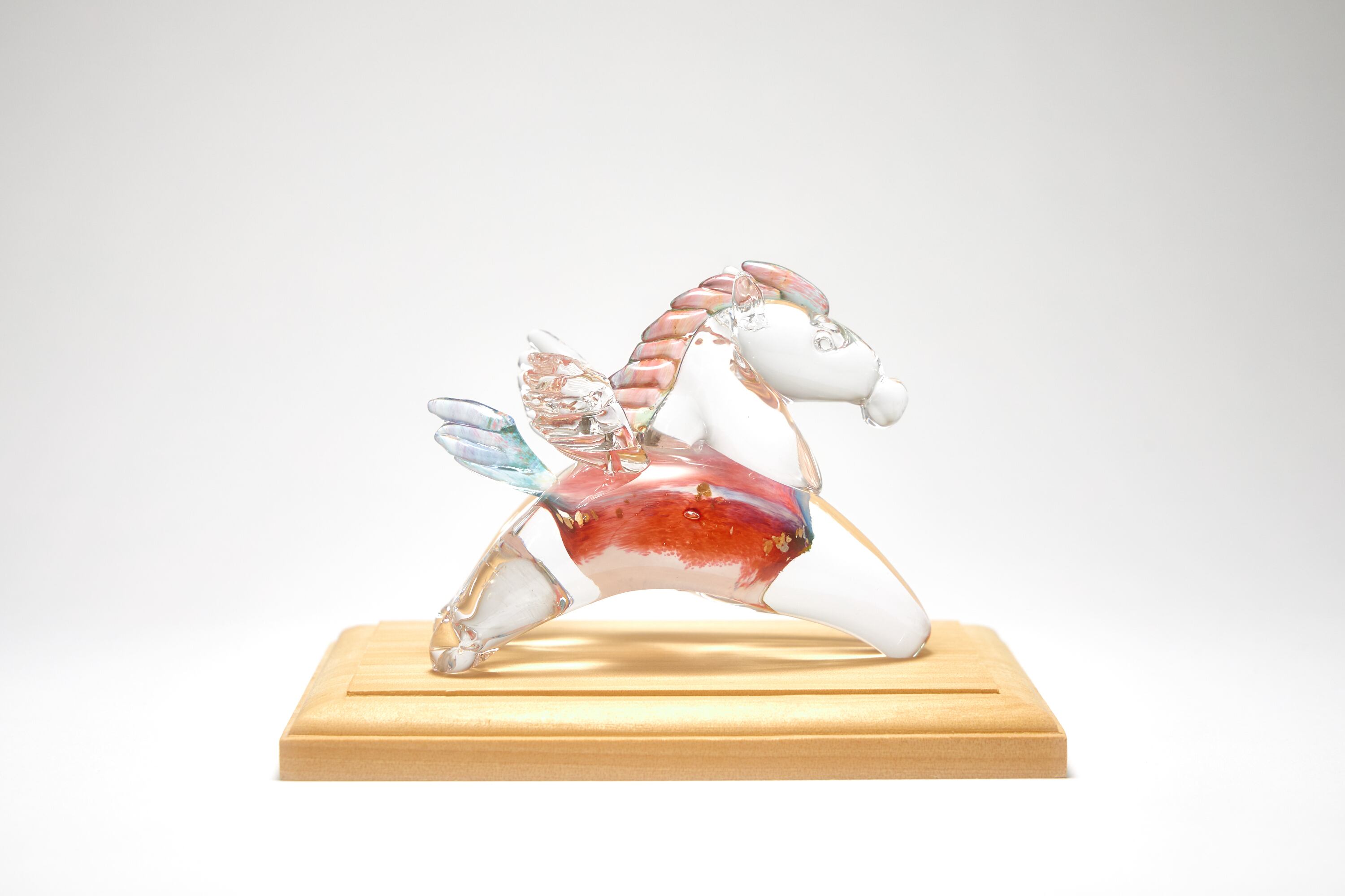私自身、ガラスという素材の柔らかさが大好きなので、午特有のしなやかな体のラインを柔らかなガラスで表現しました。疾走しているような、羽ばたいているような、駿馬をイメージして制作しています。