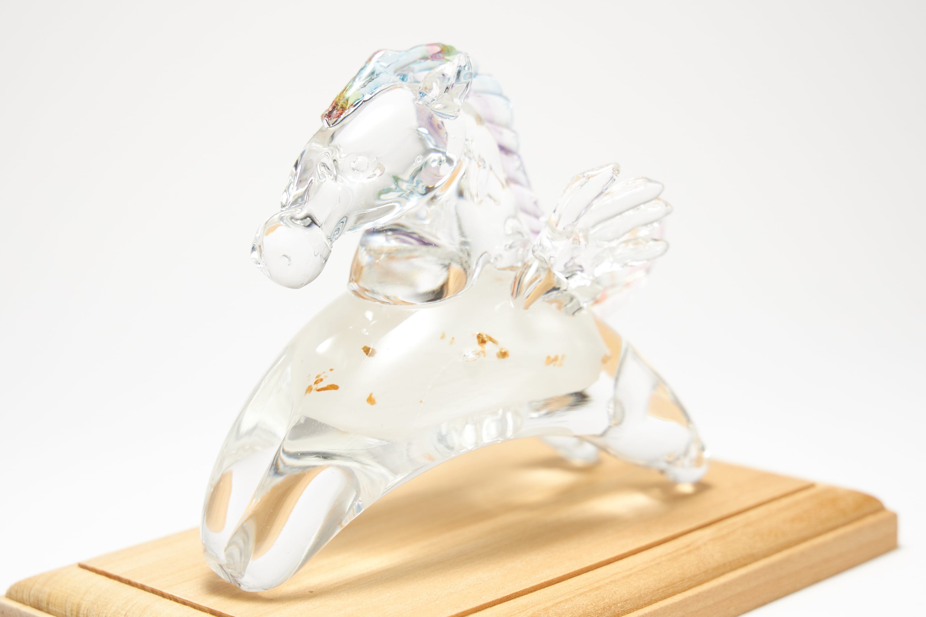 私自身、ガラスという素材の柔らかさが大好きなので、午特有のしなやかな体のラインを柔らかなガラスで表現しました。疾走しているような、羽ばたいているような、駿馬をイメージして制作しています。